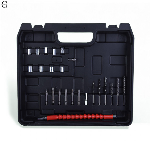 Усе у міцному кейсі з повним набором біт, свердлів та насадок.