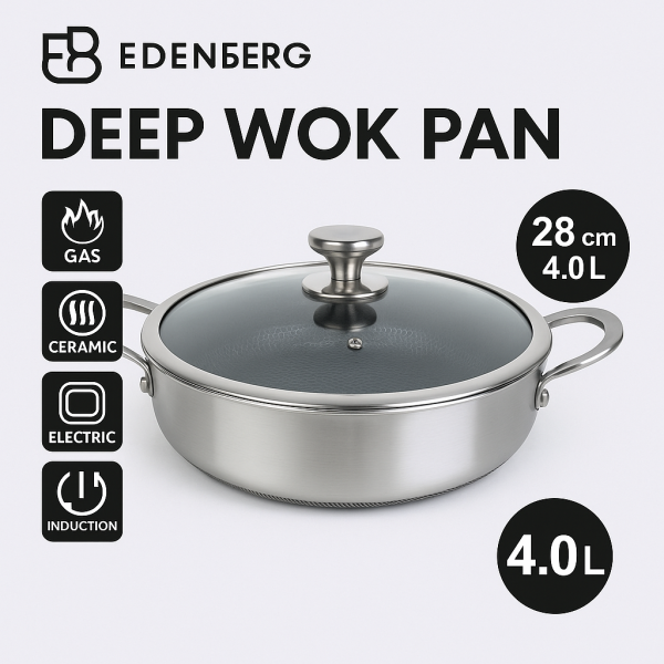 Сковорода-вок Edenberg EB-13078 – это универсальная кухонная посуда из нержавеющей стали, сочетающая стильный дизайн, прочность и многофункциональность. Благодаря диаметру 28 см и объему 4 л вок идеально подходит для приготовления больших порций, обжарки, тушения или приготовления блюд в азиатском стиле.