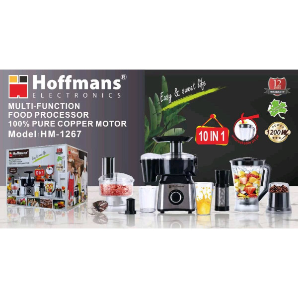 Кухонный комбайн Hoffmans 10в1 1200W HM-1267 – это мощный и универсальный помощник, который полностью изменит ваш подход к приготовлению пищи. Благодаря широкому функционалу и современным технологиям, он легко справляется с измельчением, нарезкой, смешиванием, взбиванием, натиркой и замешиванием теста. Это идеальный инструмент для создания домашних блюд от салатов и соусов до десертов и выпечки.