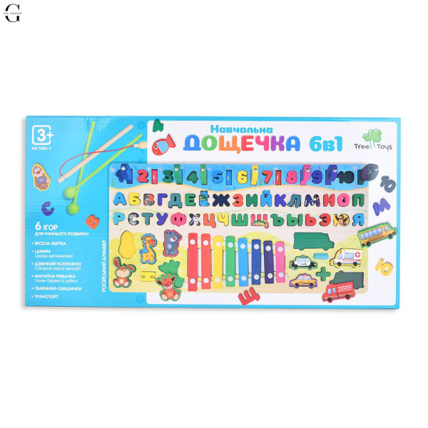 В наборе — ксилофон с 8 тонами, рамки-вкладыши с буквами, цифрами, животными и транспортом, а также магнитная рыбалка с 10 рыбками. Такой разноплановый игровой центр позволяет ребенку одновременно изучать форму, цвет, звуки, счет и научиться соотносить предметы, тренируя логику и координацию.