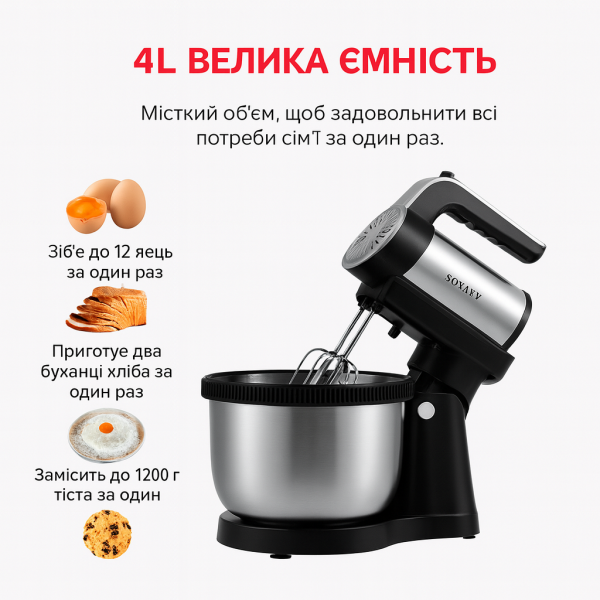 Sokany SK-6662 – это мощный кухонный миксер с двигателем 1000 Вт , который станет надежным помощником для приготовления теста, кремов, соусов и других блюд. Продуманная конструкция и универсальные насадки позволяют справиться даже с сложными задачами, а стильный дизайн украсить любую кухню.