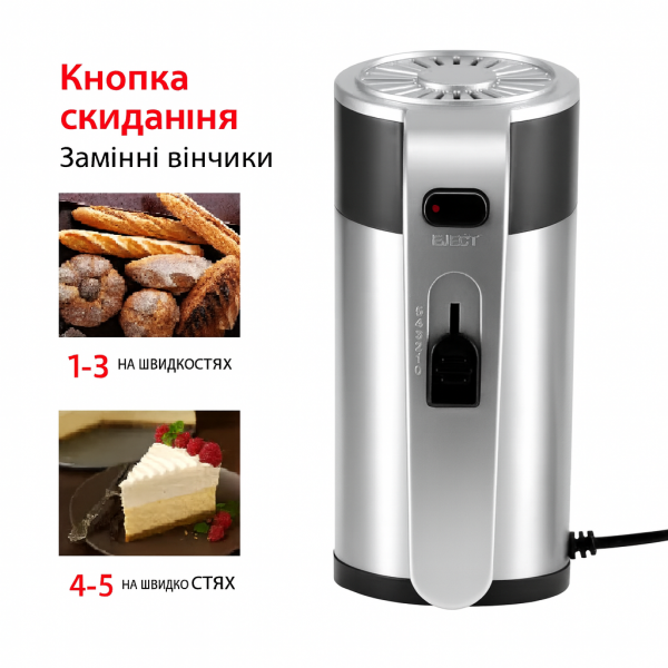 В комплекте: винчики для взбивания и крючки для теста – идеально для разных видов приготовления.
