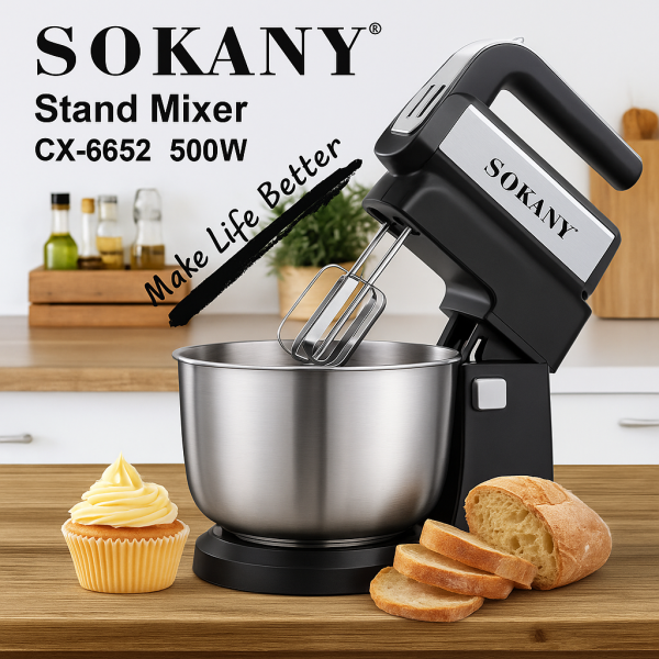 Стаціонарний міксер Sokany CX-6652 – це потужний і зручний кухонний прилад, який допоможе швидко та легко замішувати тісто й збивати інгредієнти. Завдяки потужності 500 Вт і чаші об’ємом 3,5 літра, він підходить як для щоденних рецептів, так і для приготування великих порцій.